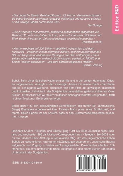 Isaak Babel, Sohn einer jüdischen Kaufmannsfamilie und in der bunten Hafenstadt Odessa aufgewachsen, erlangte in den zwanziger Jahren mit seinem Buch "Die Reiterarmee" schlagartig Weltruhm. Doch besessen von dem Plan, die gewaltigen politischen und kulturellen Umbrüche in der Sowjetunion darzustellen, geriet er ins Visier Stalins. Er wurde verhaftet und 1940 in einem Moskauer Gefängnis ermordet. Thomas Mann und Kurt Tucholsky priesen Babels Erzählkunst. Marcel Reich-Ranicki ist der Ansicht, dass ihm der Nobelpreis gebührt hätte. Doch unter Stalin in Ungnade gefallen, blieb Babel auch der Nachruhm verwehrt. In Russland trägt bis heute keine Straße seinen Namen. Die weltweit erste umfassende Babel-Biographie schließt eine schmerzliche Lücke und schildert einen beispiellosen Lebensweg.