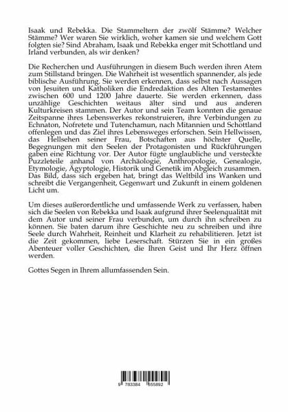 Isaak und Rebekka. Die Stammeltern der zwölf Stämme? Welcher Stämme? Wer waren Sie wirklich, woher kamen sie und welchem Gott folgten sie? Sind Abraham, Isaak und Rebekka enger mit Schottland und Irland verbunden, als wir denken? Die Recherchen und Ausführungen in diesem Buch werden ihren Atem zum Stillstand bringen. Die Wahrheit ist wesentlich spannender, als jede biblische Ausführung. Sie werden erkennen, dass selbst nach Aussagen von Jesuiten und Katholiken die Endredaktion des Alten Testamentes zwischen 600 und 1200 Jahre dauerte. Sie werden erkennen, dass unzählige Geschichten weitaus älter sind und aus anderen Kulturkreisen stammen. Der Autor und sein Team konnten die genaue Zeitspanne ihres Lebenswerkes rekonstruieren, ihre Verbindungen zu Echnaton, Nofretete und Tutenchamun, nach Mitannien und Schottland offenlegen und das Ziel ihres Lebensweges erforschen. Sein Hellwissen, das Hellsehen seiner Frau, Botschaften aus höchster Quelle, Begegnungen mit den Seelen der Protagonisten und Rückführungen gaben eine Richtung vor. Der Autor fügte unglaubliche und versteckte Puzzleteile anhand von Archäologie, Anthropologie, Genealogie, Etymologie, Ägyptologie, Historik und Genetik im Abgleich zusammen.Das Bild, dass sich ergeben hat, bringt das Weltbild ins Wanken und schreibt die Vergangenheit, Gegenwart und Zukunft in einem goldenen Licht um. Um dieses außerordentliche und umfassende Werk zu verfassen, haben sich die Seelen von Rebekka und Isaak aufgrund ihrer Seelenqualität mit dem Autor und seiner Frau verbunden, um durch ihn schreiben zu können. Sie baten darum ihre Geschichte neu zu schreiben und ihre Seele durch Wahrheit, Reinheit und Klarheit zu rehabilitieren. Jetzt ist die Zeit gekommen, liebe Leserschaft. Stürzen Sie in ein großes Abenteuer voller Geschichten, die Ihren Geist und Ihr Herz öffnen werden. Gottes Segen in Ihrem allumfassenden Sein.