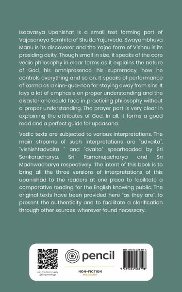 Isaavasya Upanishat is a small text forming part of Vajasaneya Samhita of Shukla Yajurveda. Swayambhuva Manu is its discoverer and the Yajna form of Vishnu is its presiding deity. Though small in size, it speaks of the core vedic philosophy in clear terms as it explains the nature of God, his omnipresence, his supremacy, how he controls everything and so on. It speaks of performance of karma as a sine-qua-non for staying away from sins. It lays a lot of emphasis on proper understanding and the disaster one could face in practicing philosophy without a proper understanding. The prayer part is very clear in explaining the attributes of God. In all, it forms a good read and a perfect guide for upaasana. Vedic texts are subjected to various interpretations. The main streams of such interpretations are ""advaita"", ""vishishtadvaita '' and ""dvaita"" spearheaded by Sri Sankaracharya, Sri Ramanujacharya and Sri Madhwacharya respectively. The intent of this book is to bring all the three versions of interpretations of this upanishad to the readers at one place to facilitate a comparative reading for the English knowing public. The original texts have been provided here ""as they are"", to present the authenticity and to facilitate a clarification through other sources, wherever found necessary.