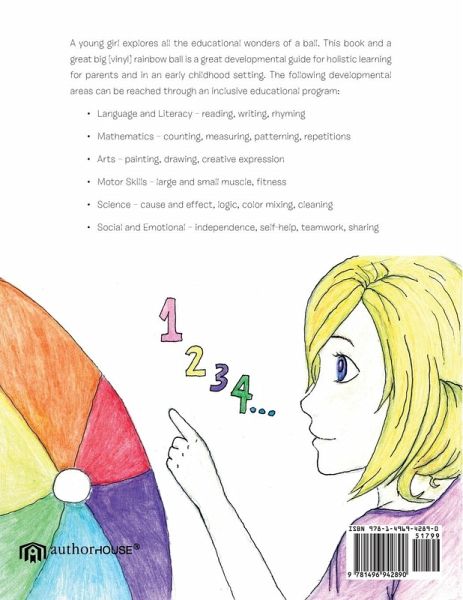 A young girl explores all the educational wonders of a ball. This book and a great big [vinyl] rainbow ball is a great developmental guide for holistic learning for parents and in an early childhood setting. The following developmental areas can be reached through an inclusive educational program: Language and Literacy ? reading, writing, rhyming Mathematics ? counting, measuring, patterning, repetitions Arts ? painting, drawing, creative expression Motor Skills ? large and small muscle, fitness Science ? cause and effect, logic, color mixing, cleaning Social and Emotional ? independence, self-help, teamwork, sharing