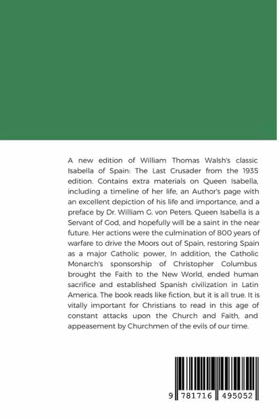 A new edition of William Thomas Walsh's classic Isabella of Spain: The Last Crusader from the 1935 edition. Contains extra materials on Queen Isabella, including a timeline of her life, an Author's page with an excellent depiction of his life and importance, and a preface by Dr. William G. von Peters. Queen Isabella is a Servant of God, and hopefully will be a saint in the near future. Her actions were the culmination of 800 years of warfare to drive the Moors out of Spain, restoring Spain as a major Catholic power, In addition, the Catholic Monarch's sponsorship of Christopher Columbus brought the Faith to the New World, ended human sacrifice and established Spanish civilization in Latin America. The book reads like fiction, but it is all true. It is vitally important for Christians to read in this age of constant attacks upon the Church and Faith, and appeasement by Churchmen of the evils of our time.