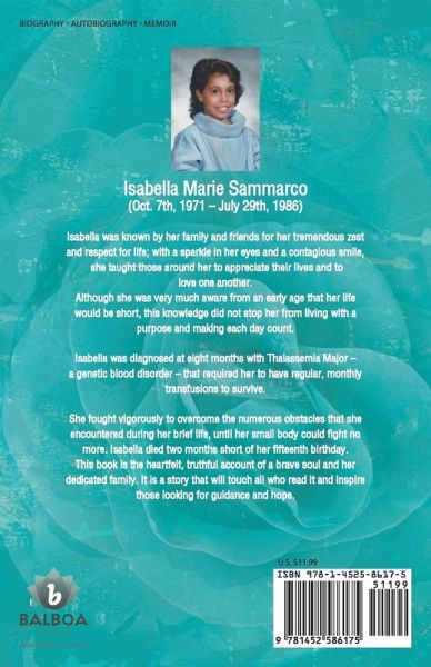Isabella Marie Sammarco (Oct. 7th, 1971 - July 29th, 1986) Isabella was known by her family and friends for her tremendous zest and respect for life; with a sparkle in her eyes and a contagious smile, she taught those around her to appreciate their lives and to love one another. Although she was very much aware from an early age that her life would be short, this knowledge did not stop her from living with a purpose and making each day count. Isabella was diagnosed at eight months with Thalassemia Major - a genetic blood disorder - that required her to have regular, monthly transfusions to survive. She fought vigorously to overcome the numerous obstacles that she encountered during her brief life, until her small body could fight no more. Isabella died two months short of her fifteenth birthday. This book is the heartfelt, truthful account of a brave soul and her dedicated family. It is a story that will touch all who read it and inspire those looking for guidance and hope.
