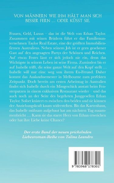 Von Männern wie ihm hält man sich besser fern oder küsst sie.Der erste Band der neuen prickelnden Liebesroman-Reihe von Talina LeandroFrauen, Geld, Luxus das ist die Welt von Ethan Taylor. Zusammen mit seinen Brüdern führt er das Familienunternehmen Taylor Real Estate, eine der größten Immobilienfirmen Australiens. Neben seinem Job ist er gern gesehener Gast auf den angesagten Partys der Schönen und Reichen. Auf etwas Festes lässt er sich jedoch nie ein, denn das Wichtigste in seinem Leben ist seine Firma. Zumindest bis er auf Isabelle trifft, die seine ganze Welt auf den Kopf stellt Isabelle will nur eins: weg von ihrem Ex-Freund. Daher kommt das Auslandssemester in Melbourne zum perfekten Zeitpunkt. Doch bereits am ersten Arbeitstag in Australien findet sich Isabelle durch ein Missgeschick anstatt beim Fensterputzen in einem exklusiven Restaurant wieder und das auch noch an der Seite des begehrten Junggesellen Ethan Taylor. Sofort knistert es zwischen den beiden und sie können der Anziehungskraft kaum widerstehen. Bis das Kartenhaus, das Isabelle mühsam aufgebaut hat am nächsten Tag zusammenbricht Kann sie das starre Herz von Ethan erweichen oder hat ihre Liebe keine Chance?Erste Leserstimmen Diese Romance glänzt mit einem Hauch Erotik, einer Prise Humor und ganz viel Gefühl. Ich konnte das Buch nicht weglegen, weil mich der Liebesroman so in seinen Bann gezogen hat ein Spiel aus Witz, Liebe, Erotik und tiefer Gefühle hier kann man sich auf eine flotte und humorvolle Lovestory freuen