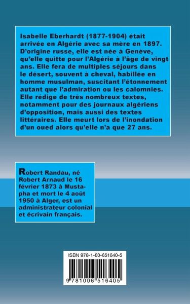 Isabelle Eberhardt (1877-1904) était arrivée en Algérie avec sa mère en 1897. D'origine russe, elle est née à Genève, qu'elle quitte pour l'Algérie à l'âge de vingt ans. Elle fera de multiples séjours dans le désert, souvent à cheval, habillée en homme musulman, suscitant l'étonnement autant que l'admiration ou les calomnies. Elle rédige de très nombreux textes, notamment pour des journaux algériens d'opposition, mais aussi des textes littéraires. Elle meurt lors de l'inondation d'un oued alors qu'elle n'a que 27 ans.