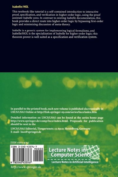 This volume is a self-contained introduction to interactive proof in high- order logic (HOL), using the proof assistant Isabelle 2002. Compared with existing Isabelle documentation, it provides a direct route into higher-order logic, which most people prefer these days. It bypasses ?rst-order logic and minimizes discussion of meta-theory. It is written for potential users rather than for our colleagues in the research world. Another departure from previous documentation is that we describe Markus Wenzel s proof script notation instead of ML tactic scripts. The l- ter make it easier to introduce new tactics on the ?y, but hardly anybody does that. Wenzel s dedicated syntax is elegant, replacing for example eight simpli?cation tactics with a single method, namely simp, with associated - tions. The book has three parts. The ?rst part, Elementary Techniques, shows how to model functional programs in higher-order logic. Early examples involve lists and the natural numbers. Most proofsare two steps long, consisting of induction on a chosen variable followed by the auto tactic. But even this elementary part covers such advanced topics as nested and mutual recursion. The second part, Logic and Sets, presents a collection of lower-level tactics that you can use to apply rules selectively. It also describes I- belle/HOL s treatment of sets, functions, and relations and explains how to de?ne sets inductively. One of the examples concerns the theory of model checking, and another is drawn from a classic textbook on formal languages.
