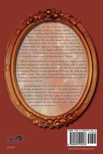 At 50, Isabelle is devastated by yet another failed relationship when she has a provocative dream about several generations of women in her family. Her mother answers a few of her questions about elements in the dream, such as the ermine stole, the aggressive snake, and the lace shawl. Yet the only way to tie together the mysteries of her life is to return to her birth place, France, and prod the truth from her irascible ninety-year-old grandmother, Mamie. While visiting Mamie in the small village of La Batie, Isabelle becomes acquainted with the old doctor, Victor, who is able to answer some of her questions. Isabelle also has the good fortune of meeting Victor's exciting grandson, Philippe, 40, with whom she falls in love. They have a beautiful romantic affair, travel to Provence together, and Isabelle's relationship with men will be changed from then on. Part psychological probe into the connective memory from one generation to another and part evocation of roads-less-traveled in the stunning countryside of southern France, Isabelle's journey answers many questions we all have about legacy and love. It also reminds us that dreams hold hidden wonders about our lives.