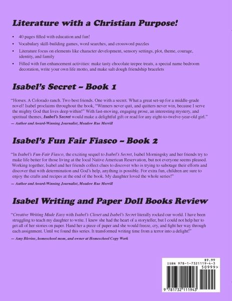 40 Pages filled with education and fun! Gallop along with 11-year-old Isabel, her horse, Starlight, and BFF Holly, as she proclaims, "Winners never quit and quitters never win, for I serve the mighty God that lives deep within!" Themes: family, identity, servanthood, perseverance, and courage. Includes makeovers, museums, Dinosaur Creek, horse races, powwows, and more! Vocabulary games, word searches, and crossword puzzles. Teaches literary elements: character growth, theme, similes, alliterations, and more. Filled with fun activities: make chocolate teepee treats, a name banner, and friendship bracelets. Special Native American Social Studies focus.