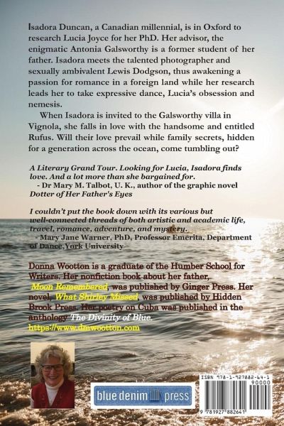Isadora Duncan, a Canadian millennial, is in Oxford to research Lucia Joyce for her PhD. Her advisor, the enigmatic Antonia Galsworthy is a former student of her father. Isadora meets the talented photographer and sexually ambivalent Lewis Dodgson, thus awakening a passion for romance in a foreign land while her research leads her to take expressive dance, Lucia's obsession and nemesis. When Isadora is invited to the Galsworthy villa in Vignola, she falls in love with the handsome and entitled Rufus. Will their love prevail while family secrets, hidden for a generation across the ocean, come tumbling out? A Literary Grand Tour. Looking for Lucia, Isadora finds love. And a lot more than she bargained for. Dr. Mary M. Talbot, U. K., author of the graphic novel Dotter of Her Father's Eyes I couldn't put the book down with its various but well-connected threads of both artistic and academic life, travel, romance, adventure, and mystery. Mary Jane Warner, PhD, Professor Emerita, Department of Dance, York University