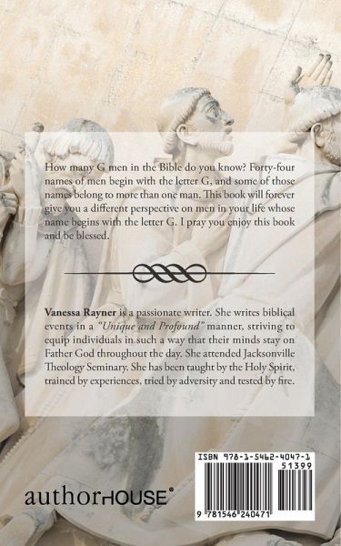 How many G men in the Bible do you know? Forty-four names of men begin with the letter G, and some of those names belong to more than one man. This book will forever give you a different perspective on men in your life whose name begins with the letter G. I pray you enjoy this book and be blessed.