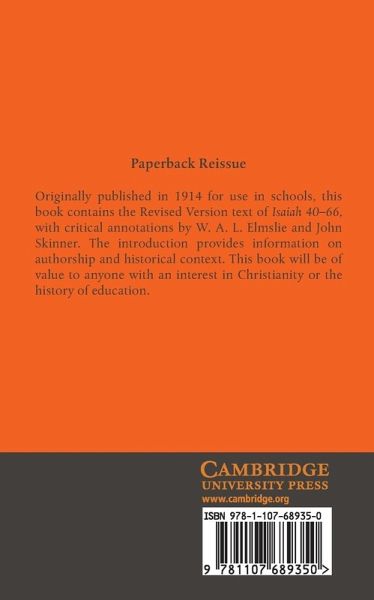 Originally published in 1914 for use in schools, this book contains the Revised Version text of Isaiah 40-66, with critical annotations by W. A. L. Elmslie and John Skinner. The introduction provides information on authorship and historical context. This book will be of value to anyone with an interest in Christianity or the history of education.