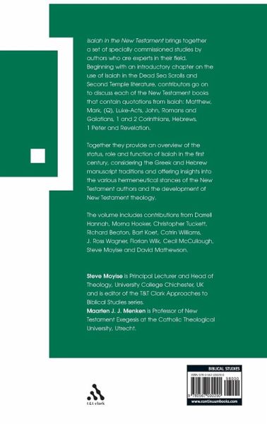 'Isaiah in the New Testament' brings together a set of specially commissioned studies by authors who are experts in the field. After an introductory chapter on the use of Isaiah in the Dead Sea Scrolls and second temple literature, each of the New Testament books that contain quotations from Isaiah are discussed: Matthew, Mark, Q, Luke-Acts, John, Romans & Galatians, 1 & 2 Corinthians, Hebrews, 1 Peter, Revelation. The book provides an overview of the status, role and function of Isaiah in the first century. It considers the Greek and Hebrew manuscript traditions and offers insights into the various hermeneutical stances of the New Testament authors and the development of New Testament theology.