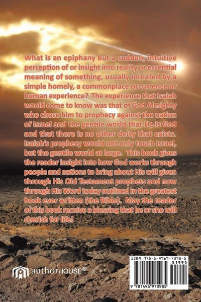 What is an epiphany but a sudden, intuitive perception of or insight into reality or essential meaning of something, usually initiated by a simple homely, a commonplace occurrence or human experience? The experience that Isaiah would come to know was that of God Almighty who chose him to prophecy against the nation of Israel and the gentile world that He is God and that there is no other deity that exists. Isaiah's prophecy would not only touch Israel, but the gentile world at large. This book gives the reader insight into how God works through people and nations to bring about His will given through His Old Testament prophets and now through His Word today outlined in the greatest book ever written (the Bible). May the reader of this book receive a blessing that he or she will cherish for life!