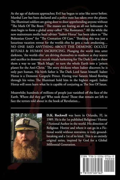 As the age of darkness approaches; Evil has begun to arise like never before. Marshal Law has been declared and a police state has taken over the planet. The Illuminati soldiers are going door to door apprehending anyone without "The Mark Of The Beast." The masses are fearing an all out holocaust: As riots begin to form a global army called "The Resistance." All the while the new mainstream media head adviser "Isaleer Horus" has been taken to "The Bohemian Grove" for "The Cremation Of Care." Thinking this was just a luxurious vacation retreat for the worlds elite he gets a rude awakening… NO ONE SAID ANYTHING ABOUT THE DEMONIC OCCULT RITUALS & HUMAN SACRIFICING. Plunging the world into utter darkness, 'the worlds elite' are driving themselves to madness as they seance and sacrifice in demonic occult rituals harkening for The Dark Lord to show them a way to use 'Black Magic' to turn the whole Earth into a 'prison planet for the Anti-Christ.' The story thickens when Isaleer discovers he is only part human. His birth father is The Dark Lord Satan himself. Isaleer Horus is a Demonic Gargoyle Prince. Having true Satanic blood flowing through his veins; The Illuminati hold him in the highest regard. Isaleer Horus will soon learn what he is capable of conjuring as The Son Of Satan. Meanwhile; hundreds of millions of people just vanished off the face of the Earth. Where did they go? Who took them? Those that remain are left to face the terrors told about in the book of Revelation...