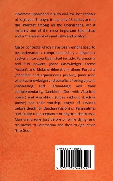 Isavasya Upanishad is 40th and last chapter of Yajurveda and is considered the first Upanishad. Though it is the smallest Upanishad with only 18 slokas, yet it contains the essence of the Vedic philosophy and spiritual wisdom. It remains one of the most profound spiritual as well as religious teaching and is spiritually very useful for every human being, irrespective of his/her faith/religion. The first sloka of this Upanishad contains the word 'Isavasyam', so it has been named Isavasya Upanishad. 'Ish or Isa' signifies Ishwar i.e. Paramatma, the Supreme or the Universal Soul and 'vasyam'…mehr