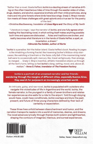 Ischia is a portrait of an unnamed narrator and protagonist who, along with her friends, wanders through the margins of different cities, especially Buenos Aires, searching for something they don't know and seems unfathomable.