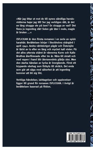 ISFLICKAN är den första romanen i en serie av episk karaktär. Berättelsen börjar i Stockholms skärgård i april 1942. Andra världskriget pågår och Östersjön är täckt av is efter en lång och mycket kall vinter. På det allra yttersta skäret är vännerna Kurre och Kalle Bruthus återförenade efter tre år. Nära till skratt och med vapen i hand blir återseendets glädje stor. Men den starka känslan av lycka är övergående. Först ett krypande obehag som förbyts till skräck. Det enda som går att säga med säkerhet är att ingenting kommer att bli sig likt. Verkliga händelser, iakttagelser och upplevelser ligger till grund för romanen ISFLICKAN. I övrigt är berättelsen baserad på fiktion.