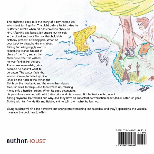 This children's book tells the story of a boy named Ish who is just turning nine. The night before his birthday, he is startled awake when his dad comes to check on him. After his dad leaves, Ish sneaks out to look in the closet and sees the box that holds his birthday present, a fishing pole. When he goes back to sleep, he dreams about fishing and using wiggly worms as bait. He wishes himself in place of the fish, and at the same time, the fish wishes he was fishing like the boy. The worm, meanwhile, cries because he doesn't want to be eaten. The water feels sorry the worm and rises up; soon Ish is on the hook in the water, the fish is on the riverbank, and the worm has slipped free. Ish cries for help-and then wakes up, realizing it was only a horrible dream. When he goes downstairs, his parents are waiting with a birthday cake and his present. But he isn't excited about fishing anymore. He tells his dad why, and they have an important conversation about Jesus. Later Ish goes fishing with his friends Hix and Bubba, and he tells them what he learned. Young readers will find the narrative and characters interesting and relatable, and they'll appreciate the valuable message the book has to offer.