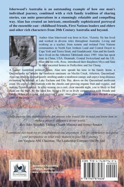 Isherwood's Australia is an outstanding example of how one man's individual journey, combined with a rich family tradition of sharing stories, can unite generations in a stunningly relatable and compelling way. Alan has created an intricate, emotionally sophisticated portrayal of the ensemble cast - childhood friends, First Nations leaders and elders and other rich characters from 20th Century Australia and beyond.Author Alan Isherwood was born in Kew, Victoria. He has lived and worked in diverse roles throughout Australia. Living and working as a teacher, from remote and isolated First Nations communities in North East Arnhem Land and Central Desert to Cape York and Torres Strait, and Guadalcanal. Alan and his family have lived on the Atherton Tablelands since 1989. Alan has spent time in China, USA, Denmark, Central Switzerland and the UK. Alan and his wife, Rose, introduced their daughters Miya and Sara to their ancestral homes in Derbyshire and Sar Chung.A former Australian political figure, Alan now spends his time in his family home, a Queenslander set amidst the rainforest sanctuary on Mazlin Creek, Atherton, Queensland. Alan can often be spotted quietly strolling under a rainforest canopy and enjoys long-distance swimming in solitude at Lake Eacham and Etty Bay, down on the Queensland north-east coast. He enjoys conversations with the chooks and growing organic fruit and veggies, and making Cornish pasties. In a dry-season, on a cool, clear moonlit night, you're likely to find Alan out the back, by the open fire, being a DJ or in lively conversation with friends and family. When all is quiet, and everyone's gone, Alan often stays on to enjoy the soft warm glow of the coals. "I fully endorse this Autobiography for anyone who would like to read and know how to make a positive difference in our world."Rev. John Woodley, Uniting Church Minister and former Senator."I commend this book for its enlightenment and enjoyment. It is an opportunity to expand your perspective on what truly matters in your life's journey."Jim Varghese AM, Chairman, The Leadership Company Qld Pty Ltd