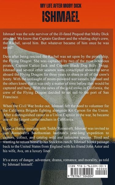 Ishmael was the sole survivor of the ill-fated Pequod that Moby Dick attacked. We know that Captain Gardiner and the whaling ship's crew, the Rachel, saved him. But whatever became of him once he was saved? Days after being rescued the Rachel was set upon by the pirate ship, the Flying Dragon. She was captained by two of the most notorious pirates, Captain Calico Jack and Captain Black Dog Billy Twigg. Ishmael and several other seamen were conscripted aboard to serve aboard the Flying Dragon for three years to share in all of the crew's booty. With the onslaught of steam-powered war vessels, Ishmael and the others knew that it was only a matter of time before they would be captured and hung. With the news of the gold strike in California, the crew of the Flying Dragon decided to set sail to the port of San Francisco. When the Civil War broke out, Ishmael felt the need to volunteer for the California Brigade fighting alongside Kit Carson for the Union. After a distinguished career as a Union Captain in the war, he became one of the largest cattle ranchers in California. Upon a chance meeting with Teddy Roosevelt, Ishmael was invited to join Roosevelt's Smithsonian Institute's year-long expedition to capture, collect, and catalog wild and unknown species. Tired and wanting to return home to his Stockton ranch, Ishmael books passage back to the United States from England with his friend John Astor and his wife, Ava, on a luxury liner. It's a story of danger, adventure, drama, romance, and morality, as told by Ishmael himself.