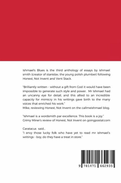 Ishmael's Blues is the third anthology of essays by ishmael smith, following Honest, Not Invent (2020) and Vent Stack (2021). Where the first book mixed posts from his blog Call Me Ishmael with a selection of rants by his earlier alter-ego, stanislav (the young polish plumber), and Vent Stack was pure stanislav, the present volume is devoted entirely to writing from the ishmael blog. There is a strong biographical element to the selection, which also continues mr ishmael's caustic examination of books, politics, Mediaminster, and the Royal Family. Among reactions to the two books already available were the following : 'It chronicles the human condition through the eyes of an outsider, but one who is unencumbered by the polite conventions imposed on us by "our betters"...please, if you have never heard of Ishmael Smith, or his alter ego, Stanislav, do yourself a great favour, buy this book, read it, use his way of deflating pomposity, and, over all else, just damned well enjoy the writings of a modern literary genius.' Grimy Miner, reviewing Honest, Not Invent on Swiss Bob's going-postal.com 'Brilliantly written - without a gift from God it would have been impossible to generate such style and power. Mr Ishmael had an uncanny eye for detail, and this allied to an incredible capacity for mimicry in his writings gave birth to the many voices that enriched his work. If you have two functioning brain cells and are fed up with the propaganda and bias daily doled out by the MSM and the PBC, and the increasing censorship that lets the powerful and connected escape scrutiny, and need an antidote, then this is it.' Mike, reviewing Honest, Not Invent on the callmeishmael blog. Caratacus said...'I envy those lucky folk who have yet to read mr ishmael's writings - boy, do they have a treat in store.' Doug Shoulders said...'I have a hardback on order to arrive in time for the bookcase I'm building. Honest, Not Invent will go top left hand side.' Bungalow Bill said...'Fabulous work. Thus are the pious humbled. Always a fine thing to see. Nice one.'