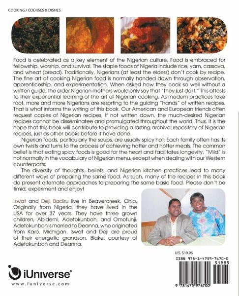 Food is celebrated as a key element of the Nigerian culture. Food is embraced for fellowship, worship, and survival. The staple foods of Nigeria include rice, yam, cassava, and wheat (bread). Traditionally, Nigerians (at least the elders) don’t cook by recipe. The fine art of cooking Nigerian food is normally handed down through observation, apprenticeship, and experimentation. When asked how they cook so well without a written guide, the older Nigerian mothers would only say that "they just do it." This attests to their experiential learning of the art of Nigerian cooking. As modern practices take root, more and more Nigerians are resorting to the guiding "hands" of written recipes. That is what informs the writing of this book. Our American and European friends often request copies of Nigerian recipes. If not written down, the much-desired Nigerian recipes cannot be disseminatee and promulgated throughout the world. Thus, it is the hope that this book will contribute to providing a lasting archival repository of Nigerian recipes, just as other books before it have done. Nigerian foods, particularly the soups, are usually spicy hot. Each family often has its own twists and turns to the process of achieving hotter and hotter meals. The common belief is that eating spicy foods is good for the heart and facilitates longevity. "Mild" is not normally in the vocabulary of Nigerian menu, except when dealing with our Western counterparts. The diversity of thoughts, beliefs, and Nigerian kitchen practices lead to many different ways of preparing the same food. As such, many of the recipes in this book do present alternate approaches to preparing the same basic food. Please don’t be timid, experiment and enjoy!