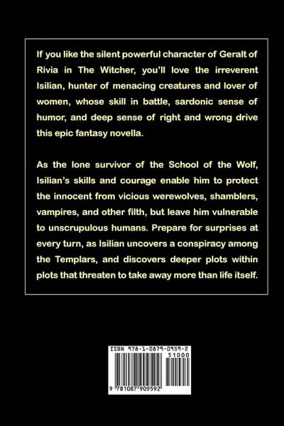 If you like the silent powerful character of Geralt of Rivia in The Witcher, you'll love the irreverent Isilian, hunter of menacing creatures and lover of women, whose skill in battle, sardonic sense of humor, and deep sense of right and wrong drive this epic fantasy novella. As the lone survivor of the School of the Wolf, Isilian's skills and courage enable him to protect the innocent from vicious werewolves, shambles, vampires, and other filth, but leave him vulnerable to unscrupulous humans. In this first book, Isilian responds to a call for a hunter to protect villagers who are being preyed on by werewolves. At first it seems like any other contract, but when he fulfills the request he discovers that he has become the unwitting instrument in the unscrupulous plans of the town mayor, who in turn is being manipulated by beings further up the food chain. Despite the gathering cloud of dark forces that seem to be plaguing the Hunter, he finds allies in the town and within the Church, who appreciate not only his strength, but also his character and dedication to truth and justice. Prepare for surprises at every turn. Not everything is as it first appears, and it is not clear who can and cannot be trusted. Trusting his instincts, Isilian uncovers a conspiracy among the Templars, and discovers deeper plots within plots that threaten to take away more than life itself.