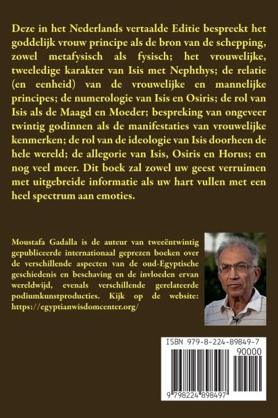 Uitleg over het metafysische en fysieke, goddelijk, vrouwelijk principe en ongeveer twintig vrouwelijk gemanifesteerde attributen. Deze in het Nederlands vertaalde Editie bespreekt het goddelijk vrouw principe als de bron van de schepping, zowel metafysisch als fysisch; het vrouwelijke, tweeledige karakter van Isis met Nephthys; de relatie (en eenheid) van de vrouwelijke en mannelijke principes; de numerologie van Isis en Osiris; de rol van Isis als de Maagd en Moeder; bespreking van ongeveer twintig godinnen als de manifestaties van vrouwelijke kenmerken; de rol van de ideologie van Isis doorheen de hele wereld; de allegorie van Isis, Osiris en Horus; en nog veel meer. Dit boek zal zowel uw geest verruimen met uitgebreide informatie als uw hart vullen met een heel spectrum aan emoties. Deze uitgebreide editie van het boek is onderverdeeld in acht hoofdstukken en drie appendices. Hoofdstuk 1: De Moeder van de Creatie behandelt de rol die Isis heeft ten tijde van de creatie, waarbij ze een beeld is van de totaliteit van creatie, en tevens haar relatie met Ra en Osiris. Hoofdstuk 2: Het Dualisme van Isis behandelt haar dualistische aard als het Heilige Intellect en tevens de Cyclus van Creatie en de Universele Baarmoeder. Hoofdstuk 3: Isis en Osiris-Het Dynamische Duo geeft uitleg over de gecombineerde rollen van Isis en Osiris bij de ontwikkeling en het ontstaan van alle creaties in het universum. Hoofdstuk 4: Isis: De Moeder van "God" behandelt haar rol in de Goddelijke onbevlekte ontvangenis van haar zoon Horus, het concept van Maagdelijkheid, haar vlucht en schuilen-samen met haar baby-voor het gevaar van de kwaadaardige machten en het opofferen van het leven van haar zoon. Hoofdstuk 5: In De numerologie van Isis en Osiris worden de getallen van Isis en Osiris, 2 en 3-welke de primaire getallen van de creatie en groei zijn; en hoe deze twee getallen alle vormen, de muzikale harmonie en het ritme van het universum doen ontstaan, beschreven. Hoofdstuk 6: Het groot aantal attributen van Isis beschrijft de zestien vrouwelijke godinnen-de manifestaties van Isis als het vrouwelijke principe van het gecreëerde universum. Hoofdstuk 7: In De Beminde in alle landen wordt de wereldwijde verspreiding van de Egyptische religie beschreven en hoe dergelijke geloven voortleven in het christendom; en hoe de religieuze festivals van Isis in het Oude Egypte door het christendom werden overgenomen voor Maria, op dezelfde datums als de Egyptische kalender. Hoofdstuk 8: Het Machtige hart gaat over de eeuwigdurende krachtige invloed van Isis op de mensheid als zoeker naar comfort en een panacee. Appendix 1: Egyptische kosmologie en allegorieën legt uit waarom goed geconstrueerde allegorieën de beste-en misschien wel de enige-manier zijn om ingewikkelde onderwerpen te behandelen zodat de informatie door iedereen wordt begrepen. Appendix 2: In De Universele Egyptische allegorie-Isis en Osiris staat een verkorte versie van het verhaal van de Egyptische allegorie over Isis en Osiris, met nadruk op de rol van Isis als het heilige vrouwelijke principe, manifestaties en gebruik. Het verhaal wordt in stukken verteld, elk gevolgd door een korte metafysische evaluatie van elk segment. Appendix 3: In Hart en ziel-Metafysische bespiegelingen staan de metafysische aspecten van het hart (Isis) en de ziel (Osiris) en hoe een mens in staat is om het hart en de ziel met elkaar samen te laten komen.