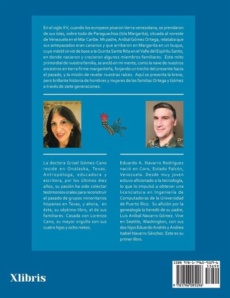 En el siglo XV, cuando los europeos pisaron tierra venezolana, se prendaron de sus islas, sobre todo de Paraguachoa (Isla Margarita), situada al noreste de Venezuela en el Mar Caribe. Mi padre, Aníbal Gómez Ortega, relataba que sus antepasados eran canarios y que arribaron a Margarita en un buque, cuyo mástil sirvió de base a la Quinta Santa Rita en el Valle del Espíritu Santo. Este mito primordial de nuestra familia, se ancló en mi mente, como la nave de nuestros ancestros en tierra firme margariteña, forjando un trecho del presente hacia el pasado. Aquí se presenta la breve, pero brillante historia de hombres y mujeres de las familias Gómez y Ortega a través de nueve generaciones. DE LOS AUTORES