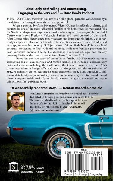 1st PLACE WINNER OF THE C.I.B.A. HEMINGWAY AWARD BEST 1st BOOK, INTERNATIONAL LATINO BOOK AWARDS "An inherently compelling read from start to finish that deftly combines the elements of espionage and romance." -MBR Bookwatch "Absolutely enthralling and entertaining. Kept me engaged to the very end." -Bare Books Podcast "This would make a great, great film." -On the Bookshelf with Doc Kirby, WTBF "A wonderfully rendered story." -Denton Record-Chronicle In late 1950's Cuba, the island's allure as an elite global paradise was cloaked by a revolution that brought down its rich and powerful. When a poor native farm boy named Victor Gomez is suddenly orphaned and adopted by one of the most influential families in his hometown, he meets and falls for Sarita Rodriguez-a fashion model and media empire heiress-just before Fidel Castro overthrows President Fulgencio Batista and takes control of the island. After Castro raids Victor's new family's estate and imprisons his father, Victor narrowly escapes and flees to the US where he accepts an unconventional, deadly deal as a spy to save his country. Still just a teen, Victor finds himself in a cycle of betrayal-struggling to find truth and purpose, while torn between protecting his now powerless parents, finding his disbanded biological siblings, and secretly pursuing Sarita as she rises to international fame from New York. Based on the true story of the author's family, Isla Vulnerable weaves a captivating tale of love, sacrifice, and human resilience in the face of extraordinary historical events-including the Cold War, the Cuban missile crisis, the CIA's covert operations in foreign affairs, Operation Mongoose, and the assassination of JFK. A dynamic cast of real-life-inspired characters, meticulous attention to historical detail, edge-of-your-seat spy scenes, and a love story that transcends social classes compose an ideologically-unbiased, heartwarming, and cinematic journey in this author's first published book.