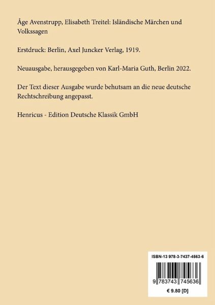 Åge Avenstrupp, Elisabeth Treitel: Isländische Märchen und VolkssagenErstdruck: Berlin, Axel Juncker Verlag, 1919.Neuausgabe, herausgegeben von Karl-Maria Guth, Berlin 2023.Der Text dieser Ausgabe wurde behutsam an die neue deutsche Rechtschreibung angepasst.Gesetzt aus der Minion Pro, 11 pt.Die Sammlung Hofenberg erscheint im Verlag Henricus - Edition Deutsche Klassik GmbH, Berlin