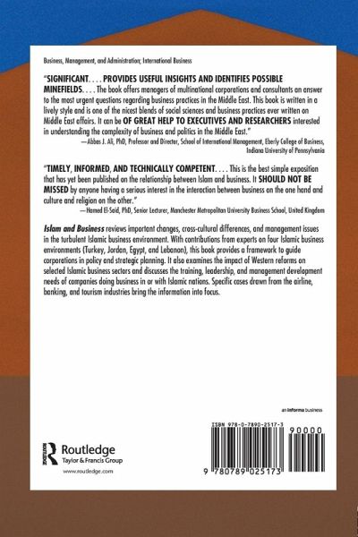 Keep up with management issues in the rapidly changing Islamic business world! Islam and Business: Cross-Cultural and Cross-National Perspectives reviews important changes, cross-cultural differences, and management issues in the turbulent Islamic business environment. With the shift from government ownership of companies and commodities toward more open markets and the product/service diversification that this change brings, the need to understand how business is done in these countries is more vital than ever before. The research in this book will help you understand the impact of Westernization upon business practices in Islamic nations. With contributions from experts on four Islamic business environments (Turkey, Jordan, Egypt, and Lebanon), this book: provides a framework to guide corporations in policy and strategic planning examines the impact of Western reforms on selected Islamic business sectors discusses the training, leadership, and management development needs of companies doing business in or with Islamic nations Section 1: Business in Turkey presents: a framework for corporate policy making and for strategic planning activities an assessment of what can cause strategic alliances to succeed or to failillustrated by a case study of the relationship between Turkish Airlines and the Qualiflyer Groupthis study considers the question in terms of goals, partner selection, alliance management, and areas of cooperation an examination of value-at-risk (VaR) models that can be used to compute market risk for financial institutionswith a study of crisis scenarios as applied to the four largest Turkish banks Section 2: Business in Jordan presents: a study of the impact Westernization has had on the efficiency of Jordanian commercial banks an examination of current practices and procedures for management training and development (MTD) needs in public and private organizations in Jordanand suggestions for future improvements an exploratory study of how national and regional socio-cultural values affect organizational cultureconsidering such factors as Power Distance (PD), Uncertainty Avoidance (UA), the Individualism-Collectivism (IDV) dimension, and the Masculinity-Femininity (MAS) dimension, as well as power culture, role orientation, achievement culture, and the support-oriented organization Section 3: Business in Egypt and Lebanon presents: a comprehensive model of relationships between transactional and transformational leadership trust in terms of organizations, organizational justice, intention to leave, and organizational citizenship behaviorusing data supplied by 179 middle and direct level managers in 17 private Egyptian organizations an analysis of the factors affecting the advancement of the Lebanese tourism industry, which has suffered tremendously in the wake of civil war and political unrest The information in Islam and Business will be helpful to anyone practicing management or studying how management works in the Islamic world. Make it a part of your professional/teaching collection today!