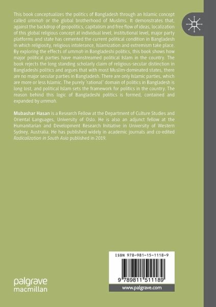 This book conceptualizes the politics of Bangladesh through an Islamic concept called ummah or the global brotherhood of Muslims. It demonstrates that, against the backdrop of geopolitics, capitalism and free flow of ideas, localization of this global religious concept at individual level, institutional level, major party platforms and state has cemented the current political condition in Bangladesh in which religiosity, religious intolerance, Islamization and extremism take place. By exploring the effects of ummah in Bangladeshi politics, this book shows how major political parties have mainstreamed political Islam in the country. The book rejects the long standing scholarly claim of religious-secular distinction in Bangladeshi politics and argues that with most Muslim-dominated states, there are no major secular parties in Bangladesh. There are only Islamic parties, which are more or less Islamic. The purely 'rational' domain of politics in Bangladesh is long lost, andpoliticalIslam sets the framework for politics in the country. The reason behind this logic of Bangladeshi politics is formed, contained and expanded by ummah.