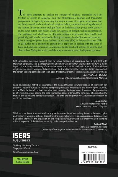 This book attempts to analyse the concept of religious expression vis-à-vis freedom of speech in Malaysia from the philosophical, political and theoretical perspectives. It begins by discussing the major sources of religious expression that are firmly rooted in the societal and religious beliefs, constitution and legislation of the country.