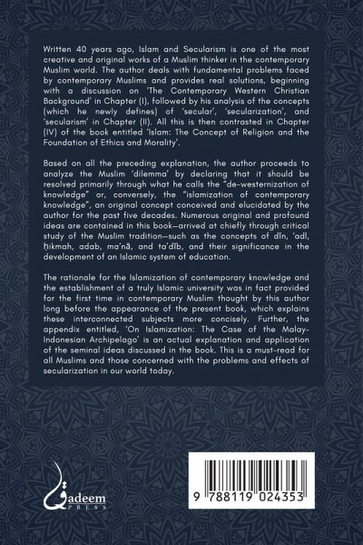 Written 40 years ago, Islam and Secularism is one of the most creative and original works of a Muslim thinker in the contemporary Muslim world. The author deals with fundamental problems faced by contemporary Muslims and provides real solutions, beginning with a discussion on 'The Contemporary Western Christian Background' in Chapter (I), followed by his analysis of the concepts (which he newly defines) of 'secular', 'secularization', and 'secularism' in Chapter (II). All this is then contrasted in Chapter (IV) of the book entitled 'Islam: The Concept of Religion and the Foundation of Ethics and Morality'. Based on all the preceding explanation, the author proceeds to analyze the Muslim 'dilemma' by declaring that it should be resolved primarily through what he calls the "dewesternization of knowledge" or, conversely, the "islamization of contemporary knowledge", an original concept conceived and elucidated by the author for the past five decades. Numerous original and profound ideas are contained in this book-arrived at chiefly through critical study of the Muslim tradition-such as the concepts of d¿n, 'adl, ¿ikmah, adab, ma'n¿, and ta'd¿b, and their significance in the development of an Islamic system of education. The rationale for the Islamization of contemporary knowledge and the establishment of a truly Islamic university was in fact provided for the first time in contemporary Muslim thought by this author long before the appearance of the present book, which explains these interconnected subjects more concisely. Further, the appendix entitled, 'On Islamization: The Case of the Malay-Indonesian Archipelago' is an actual explanation and application of the seminal ideas discussed in the book. This is a must-read for all Muslims and those concerned with the problems and effects of secularization in our world today. Islam and Secularism is a development of ideas contained in the many paragraphs of another book in Malay entitled: Risalah Untuk Kaum Muslimin, which the author wrote and completed during the first few months of 1974. Due to many circumstances which demanded the author's attention at home and ahmad, however, the Risalah has not yet been sent to the press. In this book, what is contained in Chapter III was composed and completed during the month of Ramä¿n of 1395 (1975), and delivered as a Lecture under the same title to the International Islamic Conference held in April 1976 at the Royal Commonwealth Society, London, in conjunction with the World of Islam Festival celebrated there that year. It was published as a monograph in the same year by the Muslim Youth Movement of Malaysia (ABIM), Kuala Lumpur, and in 1978 it appeared, together with other Lectures delivered on the same occasion by various Muslim scholars, in a book of one volume entitled: The Challenge of Islam, edited by Altaf Gauhar and published by the Islamic Council of Europe, London. All the other Chapters of the book were begun in March 1977 and completed in April of the same year, during my appointment as Visiting Scholar and Professor of Islamics at the Department of Religion, Temple University, Philadelphia, U.S.A., in the Winter and Spring of 1976-1977. What is contained in Chapter V was presented as a Paper entitled: "Preliminary Thoughts on the Nature of Knowledge and the Definition and Aims of Education", addressed to the First World Conference on Muslim Education held at Mecca in April 1977. It will appear, together with other selected Papers of the Conference, in a book entitled: Aims and Objectives of Islamic Education, edited with an introduction by the author and published by King Abdulaziz University and Hodder & Stoughton, London, 1979, as one of a series of seven books.
