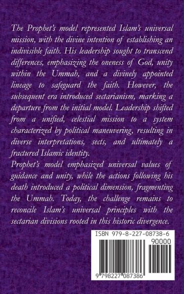 The Prophet's model represented Islam's universal mission, with the divine intention of establishing an indivisible faith. His leadership sought to transcend differences, emphasizing the oneness of God, unity within the Ummah, and a divinely appointed lineage to safeguard the faith. However, the subsequent era introduced sectarianism, marking a departure from the initial model. Leadership shifted from a unified, celestial mission to a system characterized by political maneuvering, resulting in diverse interpretations, sects, and ultimately a fractured Islamic identity.