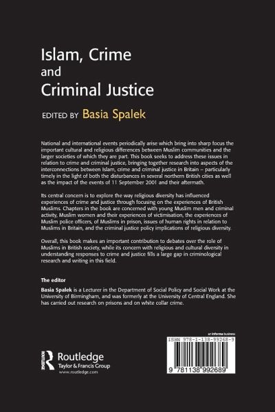 This book brings together research into key aspects of the interconnections between Islam, crime and the criminal justice system in Britain, a particularly timely collection in the light of both the recent disturbances in several northern English cities as well as the impact of the events of 11 September 2001 and their aftermath. Chapters in the book focus on young Muslim men and criminal activity, Muslim women and their experiences of victimisation, the experiences of Muslim police officers, of Muslims in prison, issues of human rights in relation to Muslims in Britain, and the criminal justice policy implications of religious diversity. Main aims pursued through the book include issues of victimisation as perceived by Muslim communities, Muslim perspectives on crime and criminal justice, and ways of addressing issues of marginalisation and exclusion within Muslim communities. Overall the book provides an important contribution to debates over the role of Muslims in British society generally, as well as their experiences of and involvement in the criminal justice system and the policy implications that arise from this.