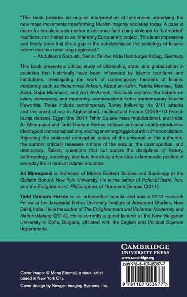 This book presents a critical study of citizenship, state and globalization in societies that have been historically influenced by Islamic traditions and institutions. Interrogating the work of contemporary theorists of Islamic modernity such as Mohammed Arkoun, Abdul an-Na'im, Fatima Mernissi, Talal Asad, Saba Mahmood and Aziz Al-Azmeh, this book explores the debate on Islam, democracy and modernity, contextualized within contemporary Muslim lifeworlds. These include contemporary Turkey (following the 9/11 attacks and the onset of war in Afghanistan), multicultural France (2009-10 French burqa debate), Egypt (the 2011 Tahrir Square mass mobilizations), and India. Ali Mirsepassi and Tadd Graham Fernée critique particular counterproductive ideological conceptualizations, voicing an emerging global ethic of reconciliation. Rejecting the polarized conceptual ideals of the universal or the authentic, the authors critically reassess notions of the secular, the cosmopolitan and democracy. Raising questions that cut across the disciplines of history, anthropology, sociology and law, this study articulates a democratic politics of everyday life in modern Islamic societies.