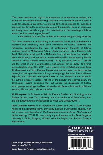 This book presents a critical study of citizenship, state and globalization in societies that have been historically influenced by Islamic traditions and institutions. Interrogating the work of contemporary theorists of Islamic modernity such as Mohammed Arkoun, Abdul an-Na'im, Fatima Mernissi, Talal Asad, Saba Mahmood and Aziz Al-Azmeh, this book explores the debate on Islam, democracy and modernity, contextualized within contemporary Muslim lifeworlds. These include contemporary Turkey (following the 9/11 attacks and the onset of war in Afghanistan), multicultural France (2009-10 French burqa debate), Egypt (the 2011 Tahrir Square mass mobilizations), and India. Ali Mirsepassi and Tadd Graham Fernée critique particular counterproductive ideological conceptualizations, voicing an emerging global ethic of reconciliation. Rejecting the polarized conceptual ideals of the universal or the authentic, the authors critically reassess notions of the secular, the cosmopolitan and democracy. Raising questions that cut across the disciplines of history, anthropology, sociology and law, this study articulates a democratic politics of everyday life in modern Islamic societies.