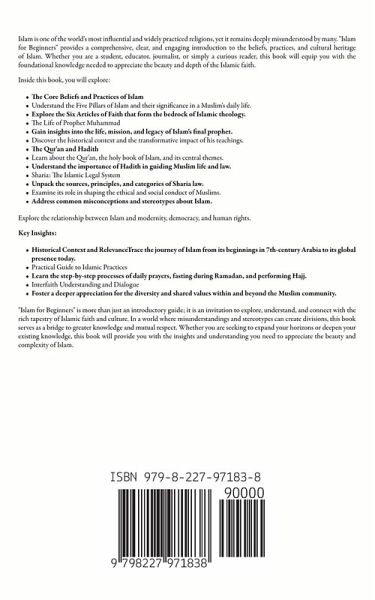 Islam is one of the world's most influential and widely practiced religions, yet it remains deeply misunderstood by many. "Islam for Beginners" provides a comprehensive, clear, and engaging introduction to the beliefs, practices, and cultural heritage of Islam. Whether you are a student, educator, journalist, or simply a curious reader, this book will equip you with the foundational knowledge needed to appreciate the beauty and depth of the Islamic faith. Inside this book, you will explore:The Core Beliefs and Practices of Islam Understand the Five Pillars of Islam and their significance in a Muslim's daily life. Explore the Six Articles of Faith that form the bedrock of Islamic theology. The Life of Prophet Muhammad Gain insights into the life, mission, and legacy of Islam's final prophet. Discover the historical context and the transformative impact of his teachings. The Qur'an and Hadith Learn about the Qur'an, the holy book of Islam, and its central themes. Understand the importance of Hadith in guiding Muslim life and law. Sharia: The Islamic Legal System Unpack the sources, principles, and categories of Sharia law. Examine its role in shaping the ethical and social conduct of Muslims. Address common misconceptions and stereotypes about Islam. Explore the relationship between Islam and modernity, democracy, and human rights. Key Insights:Historical Context and RelevanceTrace the journey of Islam from its beginnings in 7th-century Arabia to its global presence today. Practical Guide to Islamic Practices Learn the step-by-step processes of daily prayers, fasting during Ramadan, and performing Hajj. Interfaith Understanding and Dialogue Foster a deeper appreciation for the diversity and shared values within and beyond the Muslim community. "Islam for Beginners" is more than just an introductory guide; it is an invitation to explore, understand, and connect with the rich tapestry of Islamic faith and culture. In a world where misunderstandings and stereotypes can create divisions, this book serves as a bridge to greater knowledge and mutual respect. Whether you are seeking to expand your horizons or deepen your existing knowledge, this book will provide you with the insights and understanding you need to appreciate the beauty and complexity of Islam.
