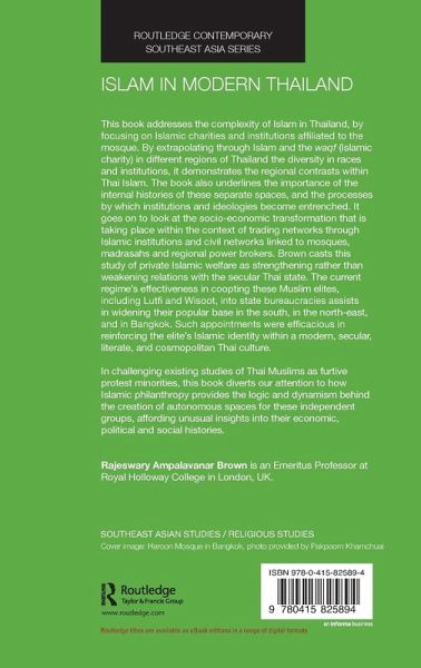 This book addresses the complexity of Islam in Thailand, by focusing on Islamic charities and institutions affiliated to the mosque. By extrapolating through Islam and the waqf (Islamic charity) in different regions of Thailand the diversity in races and institutions, it demonstrates the regional contrasts within Thai Islam. The book also underlines the importance of the internal histories of these separate spaces, and the processes by which institutions and ideologies become entrenched. It goes on to look at the socio economic transformation that is taking place within the context of trading networks through Islamic institutions and civil networks linked to mosques, madrasahs and regional power brokers. Brown casts this study of private Islamic welfare as strengthening rather than weakening relations with the secular Thai state. The current regime's effectiveness in coopting these Muslim elites, including Lutfi and Wisoot, into state bureaucracies assists in widening their popular base in the south, in the north-east, and in Bangkok. Such appointments were efficacious in reinforcing the elite's Islamic identity within a modern, secular, literate, and cosmopolitan Thai culture. In challenging existing studies of Thai Muslims as furtive protest minorities, this book diverts our attention to how Islamic philanthropy provides the logic and dynamism behind the creation of autonomous spaces for these independent groups, affording unusual insights into their economic, political and social histories.