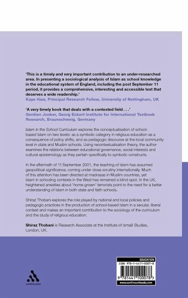 Islam in the School Curriculum explores the conceptualisation of school-based Islam on two levels: as a symbolic category in English religious education as a consequence of policy shifts, and as pedagogic discourse at the local community level in state and Muslim schools. Using recontextualisation theory, the author examines the relations between educational governance, social interests and cultural epistemology as they pertain specifically to symbolic constructs. In the aftermath of September 11 2001, the teaching of Islam has assumed geopolitical significance, coming under close scrutiny internationally. Much of this attention has been directed at madrasas in Muslim countries, yet Islam in schooling contexts in the West has remained a blind-spot. In the UK, heightened anxieties about 'home-grown' terrorists point to the need for a better understanding of Islam in both state and faith schools. Shiraz Thobani explores the role played by national and local policies and pedagogic practices in the production of school-based Islam in a secular, liberal context and makes an important contribution to the sociology of the curriculum and the study of religious education.