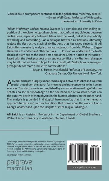 "Islam, Modernity, and the Human Sciences is a complex and demanding exposition of the epistemological problems that confront any dialogue between civilizations, especially between Islam and the West, but it is also wholly rewarding and captivating. Can a dialogue between civilizations ultimately replace the destructive clash of civilizations that has raged since 9/11? Ali Zaidi offers a masterly analysis of various attempts, from Max Weber to Jurgen Habermas, to understand other cultures[...] How can we understand the truth claims of Islam and at the same time dismiss the Other s notion of the sacred? Faced with the bleak prospect of an endless conflict of civilizations, dialogue may be all that we have to hope for. As a result, Ali Zaidi s book is an urgent prerequisite for more productive conversations." - Bryan S. Turner, Presidential Professor of Sociology, the Graduate Center, City University of New York