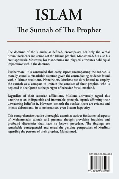 The doctrine of the sunnah, as defined, encompasses not only the verbal pronouncements and actions of the Islamic prophet, Mohammed, but also his tacit approvals. Moreover, his mannerisms and physical attributes hold equal importance within the doctrine. Furthermore, it is contended that every aspect encompassing the sunnah is morally sound, a remarkable assertion given the contradicting evidence found within Islamic traditions. Nonetheless, Muslims are duty-bound to employ the sunnah as a compass to imitate the conduct of their prophet, who is depicted in the Quran as the paragon of behavior for all mankind. Regardless of their sectarian affiliations, Muslims universally regard this doctrine as an indisputable and immutable principle, openly affirming their unwavering belief in it. However, beneath the surface, there are evident and intense debates and, in some instances, even blatant hypocrisy. This comprehensive treatise thoroughly examines various fundamental aspects of Mohammed's sunnah and presents thought-provoking inquiries and profound discoveries that have no known precedent. The findings are remarkably consequential and reveal the genuine perspectives of Muslims regarding the persona of their prophet, Mohammed.