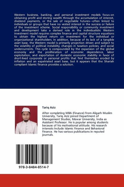 Western business, banking, and personal investment models focus on obtaining profit and storing wealth through the accumulation of interest, dividend payments, or the sale of negotiable futures-often linked to individuals or groups that have no vested interest in the success or failure of the investment scheme. Social responsibility or community investment and development take a derived role in the individualistic Western investment model requires complex finance and capital structure equations to obtain the highest return on investment for the individual or organizational shareholders. In addition, because of its lack of a tangible asset base, the Western model is primarily projection driven and subject to the volatility of political instability, changes in taxation policies, and social undercurrents. This cycle is compounded by the expansion of the global economy and the proliferation of economic dependence, labor exploitation, and exportation of domestic economic stability in favor of short-lived corporate or personal profits that find themselves eroded by inflation and an expatriated asset base, but it appears that the Shariah compliant Islamic finance provides a solution.