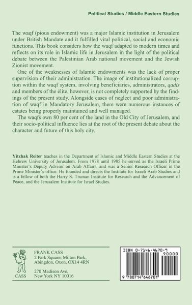 The waqf (pious endowment) was a major Islamic institution in Jerusalem under British Mandate and it fulfilled vital political, social and economic functions. This book considers how the waqf adapted to modern times and reflects on its role in Islamic life in Jerusalem in the light of the political debate between the Palestinian Arab national movement and the Jewish Zionist movement. One of the weaknesses of Islamic endowments was the lack of proper supervision of their administration. The image of institutionalized corruption within the waqf system, involving beneficiaries, administrators, qadis and members of the elite, however, is not completely supported by the findings of the present study. Alongside cases of neglect and poor administration of waqf in Mandatory Jerusalem, there were numerous instances of estates being properly maintained and well managed. The waqfs own 80 per cent of the land in the Old City of Jerusalem, and their socio-political influence lies at the root of the present debate about the character and future of this holy city.