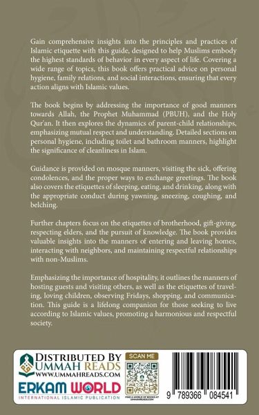 This book provides a comprehensive guide to essential Islamic etiquette, focusing on good manners towards Allah, the Prophet, and fellow humans. It is designed to instill a sense of spirituality and discipline in readers of all ages. The text is presented in a clear and accessible manner, incorporating both theoretical knowledge and practical steps. Each section is enriched with religious insights, practical advice, and examples, ensuring that readers can grasp the significance and proper conduct in various aspects of life. The book serves as an invaluable resource for Muslims seeking to enhance their character and adhere to Islamic principles in their daily interactions. It covers a wide range of topics, including personal hygiene, social etiquette, and environmental cleanliness. By following the teachings and instructions provided, readers can lead a life that is pleasing to Allah and beneficial to society. Table of Contents: 1. Islamic Etiquette 2. Rules of Manners and Courtesy 3. Good Manners Towards Allah Almighty 4. Good Manners Towards Our Prophet 5. Showing Good Manners and Gratification Towards the Holy Qur'an 6. Good Manners Between Parents and Children 7. Personal Hygiene 7.1 How do we Maintain Our Personal Hygiene? 7.2 As if About to Enter the Divine Presence... (A Story) 8. Toilet Manners 8.1 What should we pay attention to in the toilet? 8.2 How do we wash up in the toilet (taharah)? 9. Bathroom Manners 9.1 What should be paid attention when cleaning the body in the bathroom? 10. Environmental Cleaning 11. Mosque Manners 11.1 Reading 12. Manners of Visiting Patients 13. Manners of Offering Condolences and Participation to the Funeral 14. Etiquette for Exchanging Greetings 14.1 What should we pay attention to while giving salam? 14.2 The Pleasure of Exchanging Salams 14.3 In what situations do not we give or return salams? 15. Etiquette for Sleeping and Resting 16. Etiquette for Eating and Drinking 16.1 What should we pay attention to before starting to eat? 16.2 What should we pay attention while eating? 16.3 We should never do the following while eating and drinking! 16.4 What to do after eating! 16.5 A Date-Tasted Memory 17. Etiquette for Yawning, Sneezing, Coughing, and Belching 18. Manners of Brotherhood 18.1 A Legendary Feat (A Story) 19. The Manners of Giving-Receiving Gifts 19.1 What to pay attention when offering gifts? 19.2 What kind of gifts are unacceptable? 19.3 A Single Shirt 20. Showing Respect to the Elders 20.1 How do we show respect to our elders? 20.2 This is How Respect is Shown! 20.3 If Only They Took a Lesson (A Story) 21. Manners of Learning 22. The Manners of Entering and Leaving the House 22.1 What to pay attention to when entering or leaving a house? 22.2 You Must Ask Permission (Story) 22.3 What not to do when entering or leaving a house? 23. Manners of Neighborhood 24. Manners to be Observed in Relationship with Non-Muslims 24.1 They Took Refuge in Us (A Story A Lesson) 25. Manners of Hosting Guests and Visiting Others 26. The Manners of Travelling 26.1 To what we pay attention during our journeys? 26.2 An Exemplary Journey 27. Loving the Youngsters 28. The Manners of Friday 29. Manners of Shopping 30. Manners of Talking and Listening 31. Manners of Speaking Over the Phone