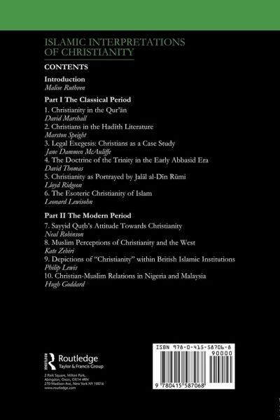 Introduction, Malise Ruthven Part 1 The Classical Period Chapter 1 Christianity in the Qur'?n, David Marshall Chapter 2 Christians in the ?ad?th Literature, Marston Speight Chapter 3 Legal Exegesis: Christians as a Case Study, John Dammen McAuliffe Chapter 4 The Doctrine of the Trinity in the Early Abbasid Era, David Thomas Chapter 5 Christianity as Portrayed by Jal?l al-D?n R?m?, Lloyd Ridgeon Chapter 6 The Esoteric Christianity of Islam: Interiorisation of Christian Imagery in Medieval Persian Sufi Poetry, Leonard Lewisohn Part 2 The Modern Period Chapter 7 Sayyid Qu?b's Attitude Towards Christianity: s?ra 9.29-35 in F? ?il?l Al-Qur'?n, Neal Robinson Chapter 8 Muslim Perceptions of Christianity and the West, Kate Zebiri Chapter 9 Depictions of "Christianity" within British Islamic Institutions, Philip Lewis Chapter 10 Christian-Muslim Relations in Nigeria and Malaysia, Hugh Goddard