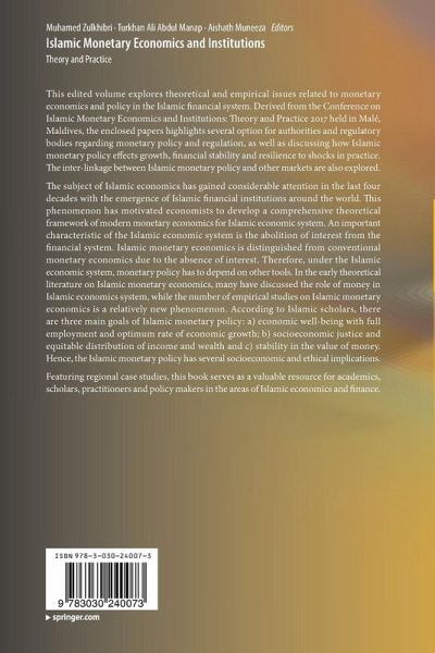 This edited volume explores theoretical and empirical issues related to monetary economics and policy in the Islamic financial system. Derived from the Conference on Islamic Monetary Economics and Institutions: Theory and Practice 2017 held in Malé, Maldives, the enclosed papers highlights several option for authorities and regulatory bodies regarding monetary policy and regulation, as well as discussing how Islamic monetary policy effects growth, financial stability and resilience to shocks in practice. The inter-linkage between Islamic monetary policy and other markets are also explored. The subject of Islamic economics has gained considerable attention in the last four decades with the emergence of Islamic financial institutions around the world. This phenomenon has motivated economists to develop a comprehensive theoretical framework of modern monetary economics for Islamic economic system. An important characteristic of the Islamic economic system is the abolition of interest from the financial system. Islamic monetary economics is distinguished from conventional monetary economics due to the absence of interest. Therefore, under the Islamic economic system, monetary policy has to depend on other tools. In the early theoretical literature on Islamic monetary economics, many have discussed the role of money in Islamic economics system, while the number of empirical studies on Islamic monetary economics is a relatively new phenomenon. According to Islamic scholars, there are three main goals of Islamic monetary policy: a) economic well-being with full employment and optimum rate of economic growth; b) socioeconomic justice and equitable distribution of income and wealth and c) stability in the value of money. Hence, the Islamic monetary policy has several socioeconomic and ethical implications. Featuring regional case studies, this book serves as a valuable resource for academics, scholars, practitioners and policy makers in the areas of Islamic economics and finance.