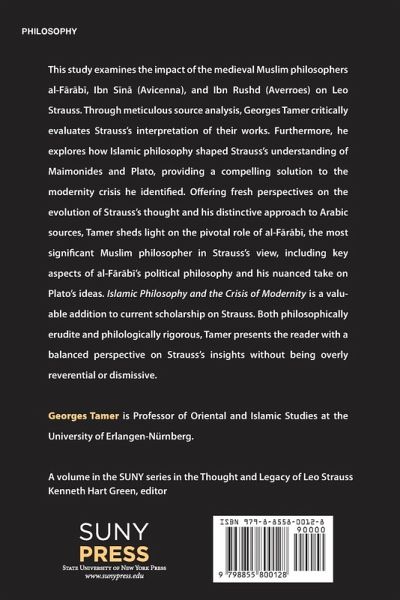 Unveils the profound influence of medieval Islamic philosophy on the thought of Leo Strauss. This study examines the impact of the medieval Muslim philosophers al-F¿r¿b¿, Ibn S¿n¿ (Avicenna) and Ibn Rushd (Averroes) on Leo Strauss. Through meticulous source analysis, Georges Tamer critically evaluates Strauss's interpretation of their works. Furthermore, he explores how Islamic philosophy shaped Strauss's understanding of Maimonides and Plato, providing a compelling solution to the modernity crisis he identified. Offering fresh perspectives on the evolution of Strauss's thought and his distinctive approach to Arabic sources, Tamer sheds light on the pivotal role of al-F¿r¿b¿, the most significant Muslim philosopher in Strauss's view, including key aspects of al-F¿r¿b¿'s political philosophy and his nuanced take on Plato's ideas. Islamic Philosophy and the Crisis of Modernity is a valuable addition to current scholarship on Strauss. Both philosophically erudite and philologically rigorous, Tamer presents the reader with a balanced perspective on Strauss's insights without being overly reverential or dismissive.