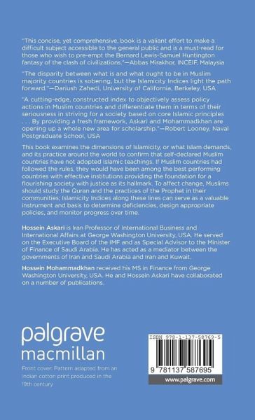 "The attentive public is familiar with the five pillars of Islam, which prescribe how Muslims should behave at the individual level. Much less is known, however, about injunctions by the Quran and the Prophet on the distinguishing social, economic, and political features of the just Islamic order, enabling self-proclaimed 'Islamists' and pundits to fill the void. Askari and Mohammadkhan have rendered an invaluable service by distilling the primary socio-economic and political teachings of Islam in the form of measurable Islamicity Indices. The disparity between what is and whatought to be in Muslim majority countries is sobering, but the Islamicity Indices light the path forward." Dariush Zahedi, Director of the Berkeley Program on Entrepreneurship and Development in the Middle East, University of California, Berkeley, USA